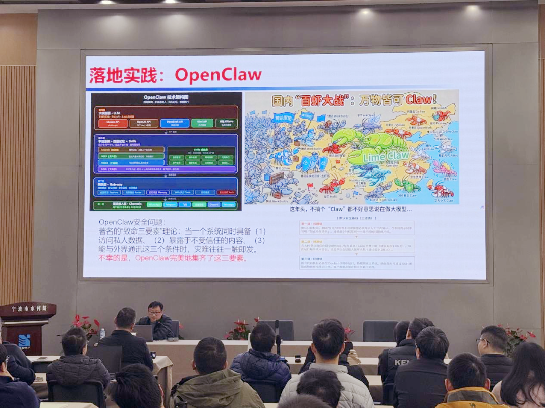 本次專題培訓(xùn)圍繞AI智能體的概念展開,簡要分析其與大模型的區(qū)別,系統(tǒng)闡述了智能體的發(fā)展歷程、構(gòu)成要素及落地實(shí)施路徑,并現(xiàn)場演示了“數(shù)智水院智能體”及當(dāng)下流行的OpenClaw等應(yīng)用實(shí)踐案例。演示環(huán)節(jié)生動直觀,引發(fā)參訓(xùn)干部的濃厚興趣。大家紛紛表示深受啟發(fā),對AI賦能勘察設(shè)計工作有了更清晰的認(rèn)知和更強(qiáng)的信心。