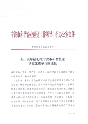 我院榮獲寧波市第七批“和諧企業(yè)創(chuàng)建先進(jìn)單位”榮譽(yù)稱號