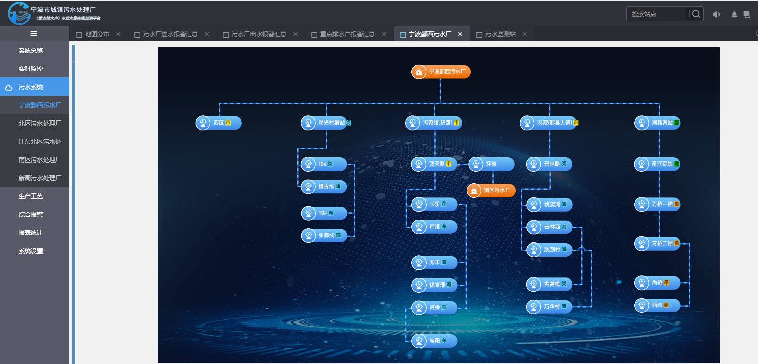 對(duì)轄區(qū)范圍內(nèi)的城鎮(zhèn)污水處理廠進(jìn)行管理,結(jié)合污水管理需求,開發(fā)污水廠站點(diǎn)管理、污水廠進(jìn)出水報(bào)警、各級(jí)污水廠實(shí)時(shí)數(shù)據(jù)監(jiān)控、污水系統(tǒng)統(tǒng)計(jì)、生產(chǎn)工藝展示、污水廠巡檢等功能,實(shí)現(xiàn)城鎮(zhèn)污水系統(tǒng)的高效在線化管理。
