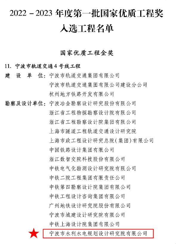 喜訊!我院參與設(shè)計(jì)的寧波軌道交通4號(hào)線工程榮獲國(guó)家優(yōu)質(zhì)工程金獎(jiǎng)