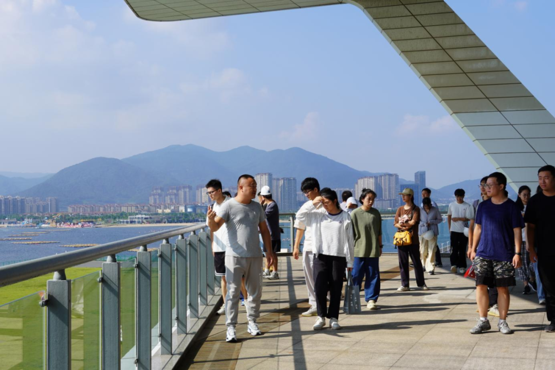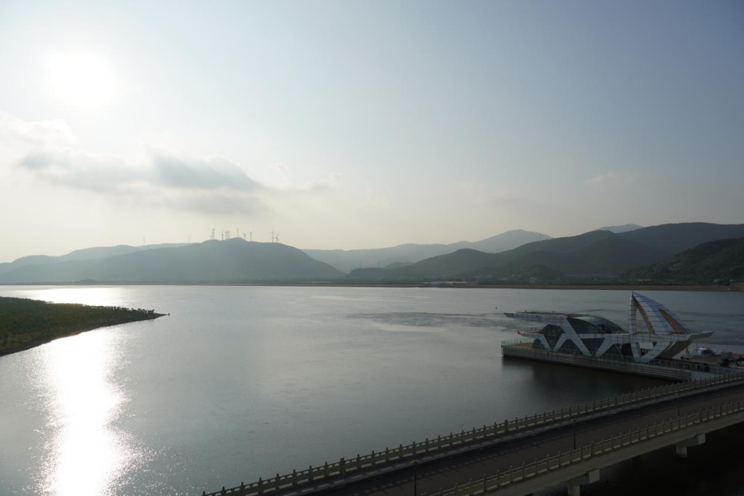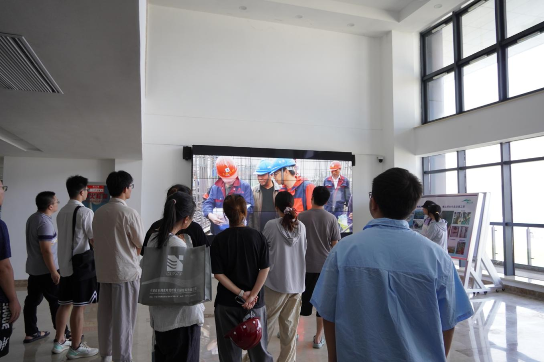 梅山灣外,銀浪拍岸;梅山灣內(nèi),碧波含翠。首先,研學隊伍到達梅山灣建設(shè)管理中心,跟隨工作人員登樓參觀,眺望南堤樞紐及附近設(shè)施,聆聽工程總體建設(shè)情況,并觀看宣傳片,了解該工程的誕生始末。