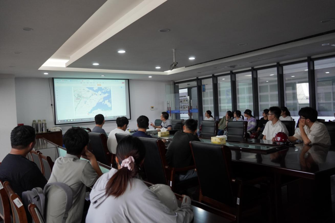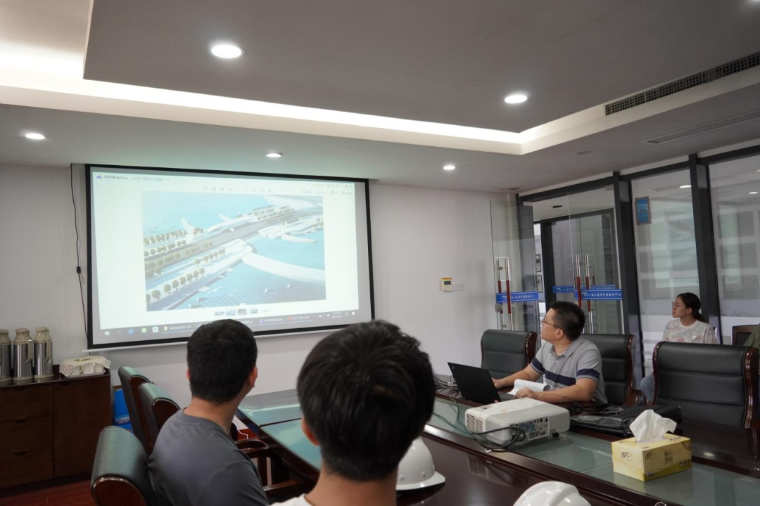 接著,研學隊伍來到會議室,胡經(jīng)理結(jié)合建設(shè)目標、工程建設(shè)客觀因素、工程效益和景觀效果,詳細講解設(shè)計思路、問題對策和創(chuàng)新點,為大家上了一堂嚴謹生動的復(fù)盤課。比如海堤采用緩坡入海,外側(cè)采用異形結(jié)構(gòu)塊消浪,內(nèi)坡采用生態(tài)水工磚美化,使海堤具備結(jié)構(gòu)和生態(tài)景觀雙重效果;船閘與海堤銜接段軟土處理采用新型技術(shù)應(yīng)用——樁網(wǎng)復(fù)合地基,形成“樁-網(wǎng)-土”協(xié)同工作共同承載的復(fù)合工藝。在座職工認真聆聽梅山灣如何從曾經(jīng)的“漲潮黃沙水,落潮滿目泥”到如今的“水清、岸綠、波寧、潮平”,受益匪淺。