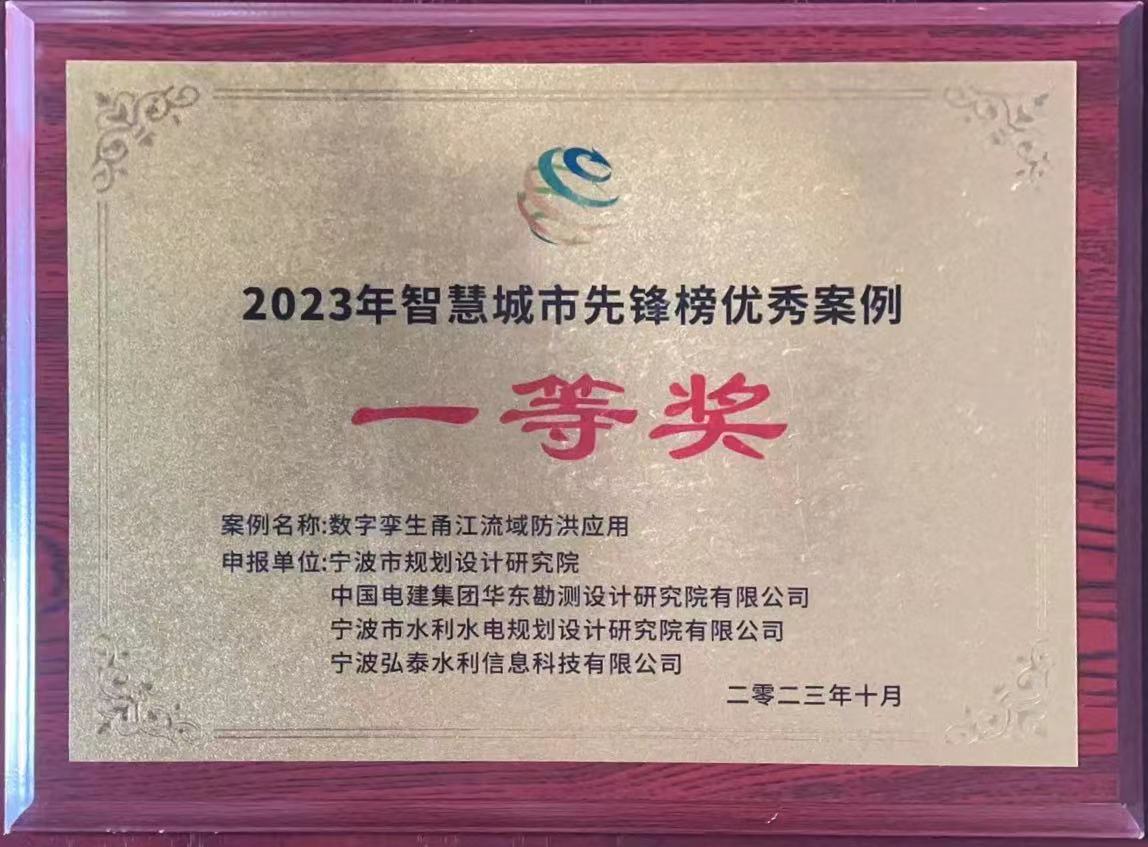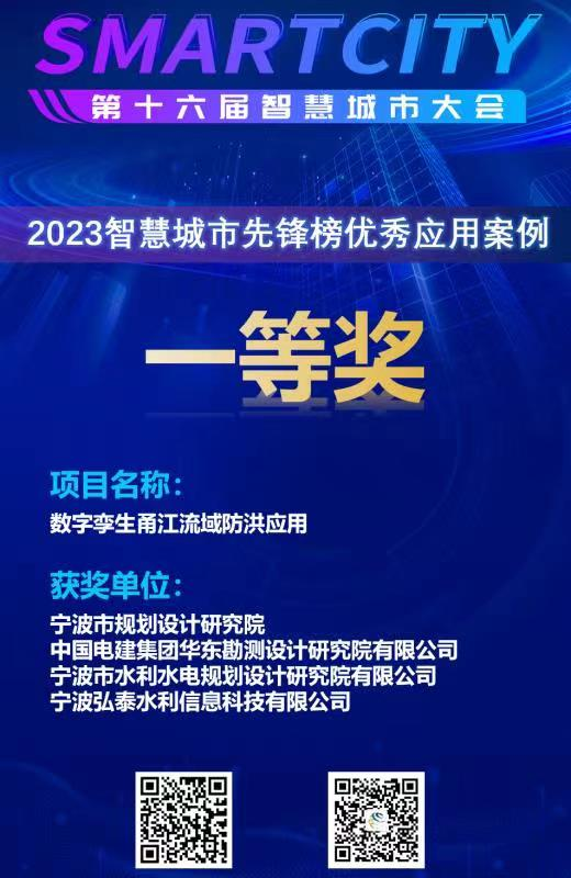 近日,我院與寧波市規(guī)劃設(shè)計研究院、華東勘測設(shè)計研究院有限公司、寧波弘泰水利信息科技有限公司共同承擔(dān)的“數(shù)字孿生甬江流域防洪應(yīng)用”項目作為寧波智慧城市創(chuàng)新應(yīng)用成果,精彩亮相“第十六屆中國智慧城市大會”,并榮獲2023智慧城市先鋒榜優(yōu)秀應(yīng)用案例一等獎,同時入選《中國智慧城市優(yōu)秀應(yīng)用案例集(2023)》,已由中國電力出版社出版發(fā)行。